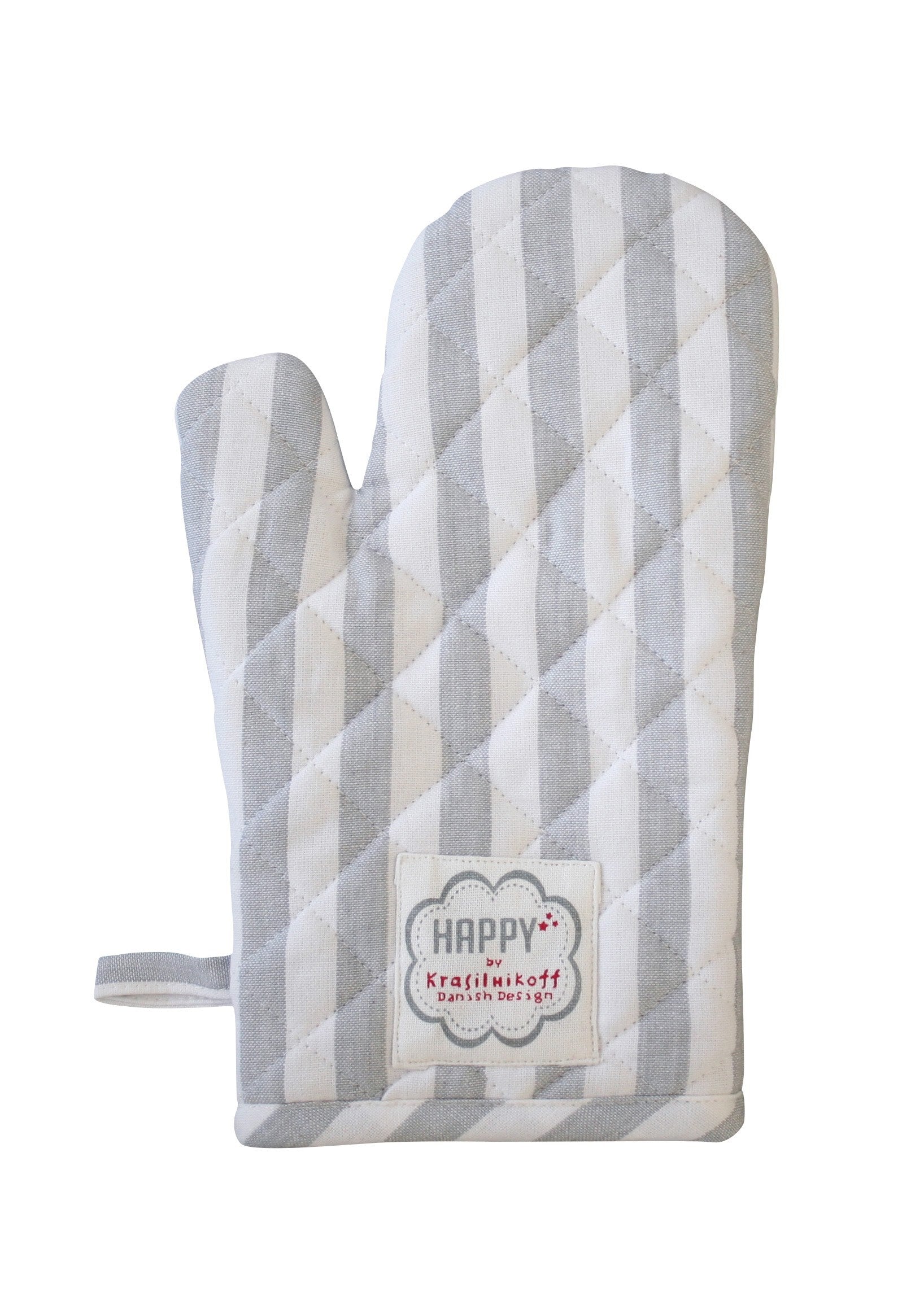 Grau-weisse Backhandschuhe, Baumwolle, waschbar. Dänisches Design.