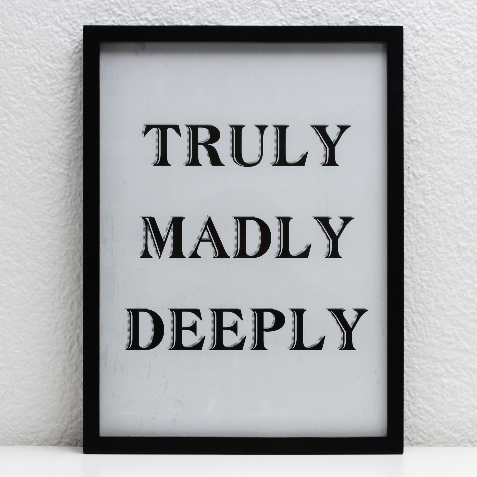 Bild mit dem Spruch "Truly, madly, deeply" mit schwarzem Rahmen aus Holz.