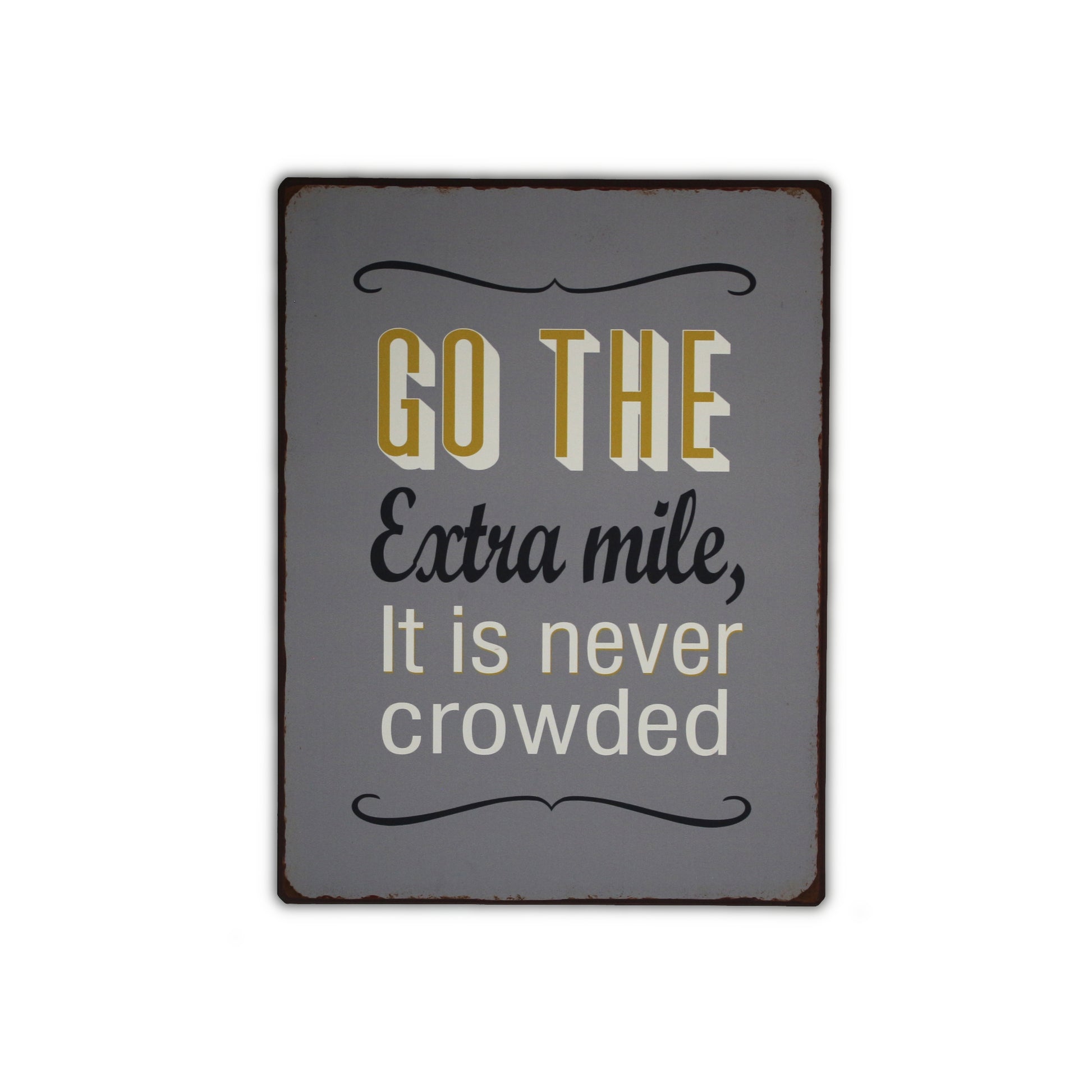 Schild aus Blech mit dem Spruch: Go the extra mile, it is never crowded. Kann mit zwei Nägeln aufgehängt werden.