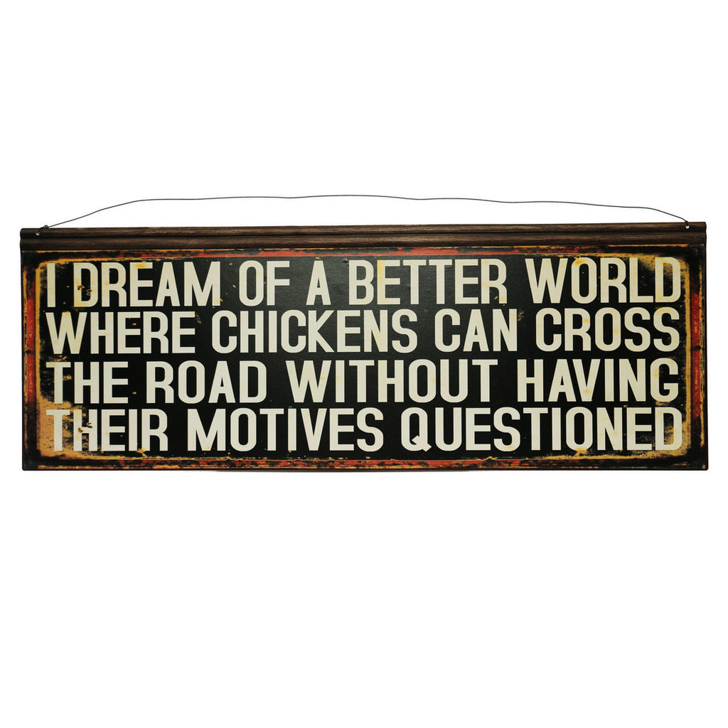 Blechschild: I dream of a better world where chickens can cross the road without having their motives questioned