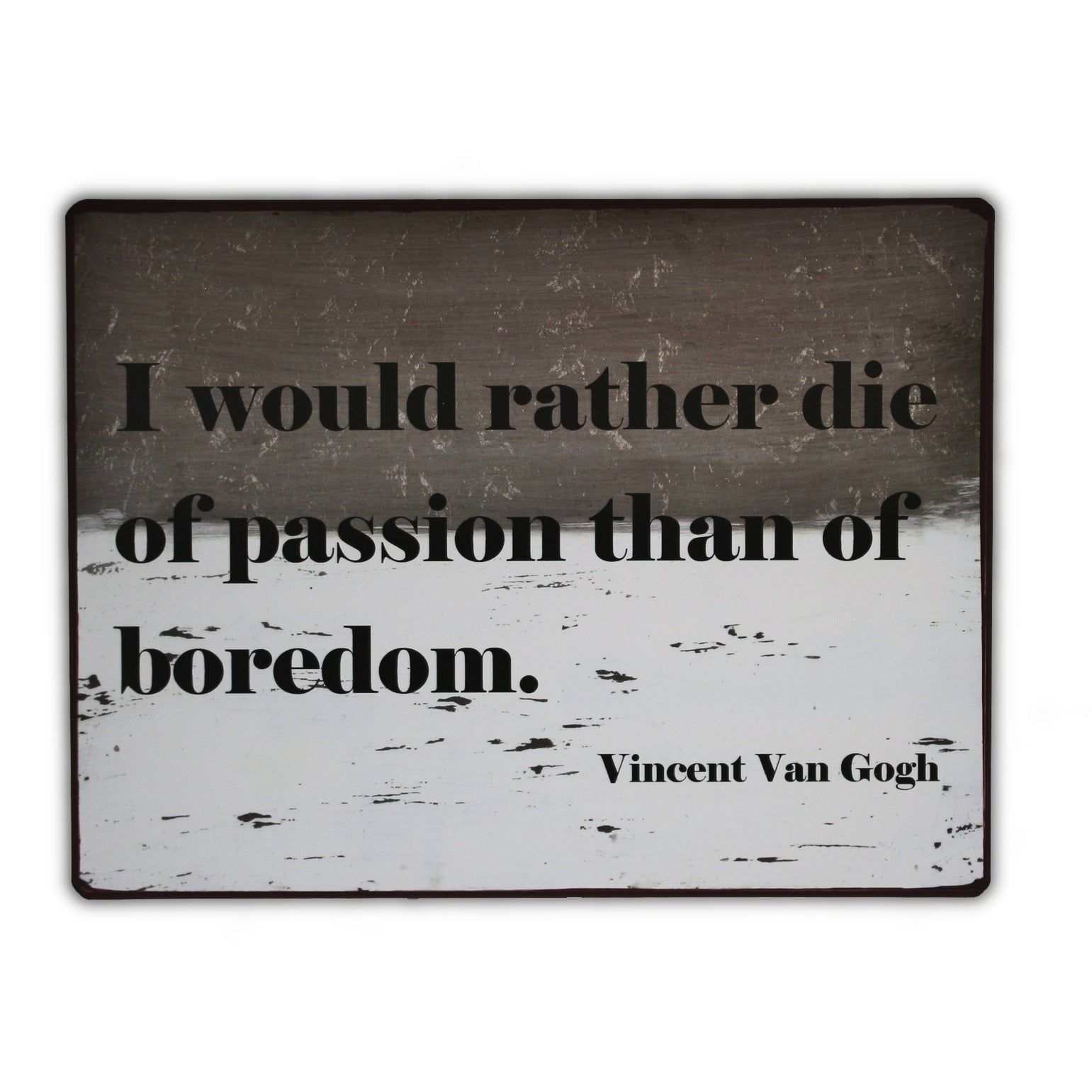 Schild aus Blech mit dem Text I would rather die of passion than of boredom. Kann mit zwei Nägeln aufgehängt werden.