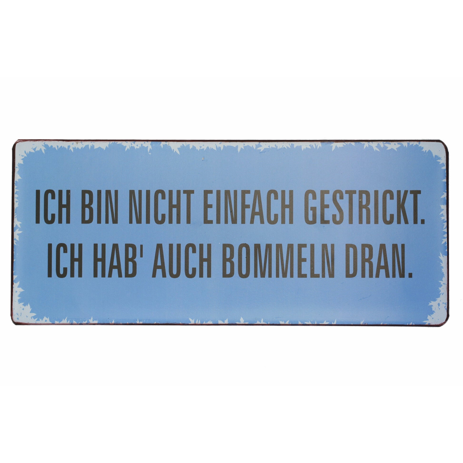 Schild aus Blech mit dem Text Ich bin nicht einfach gestrickt. Ich hab' auch Bommeln dran Kann mit zwei Nägeln aufgehängt werden.