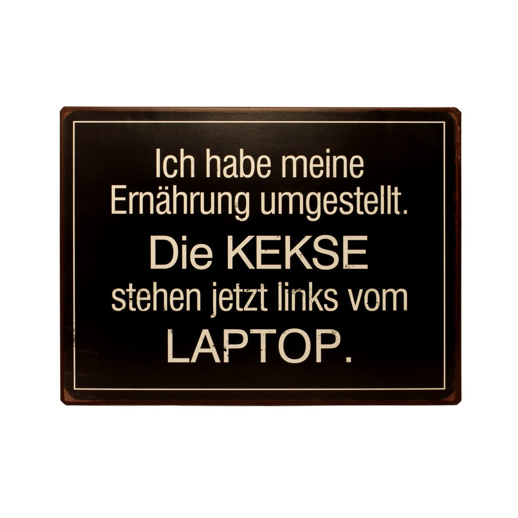 Blechschild: Ich habe meine Ernährung umgestellt. Die Kekse stehen jetzt links vom Laptop.