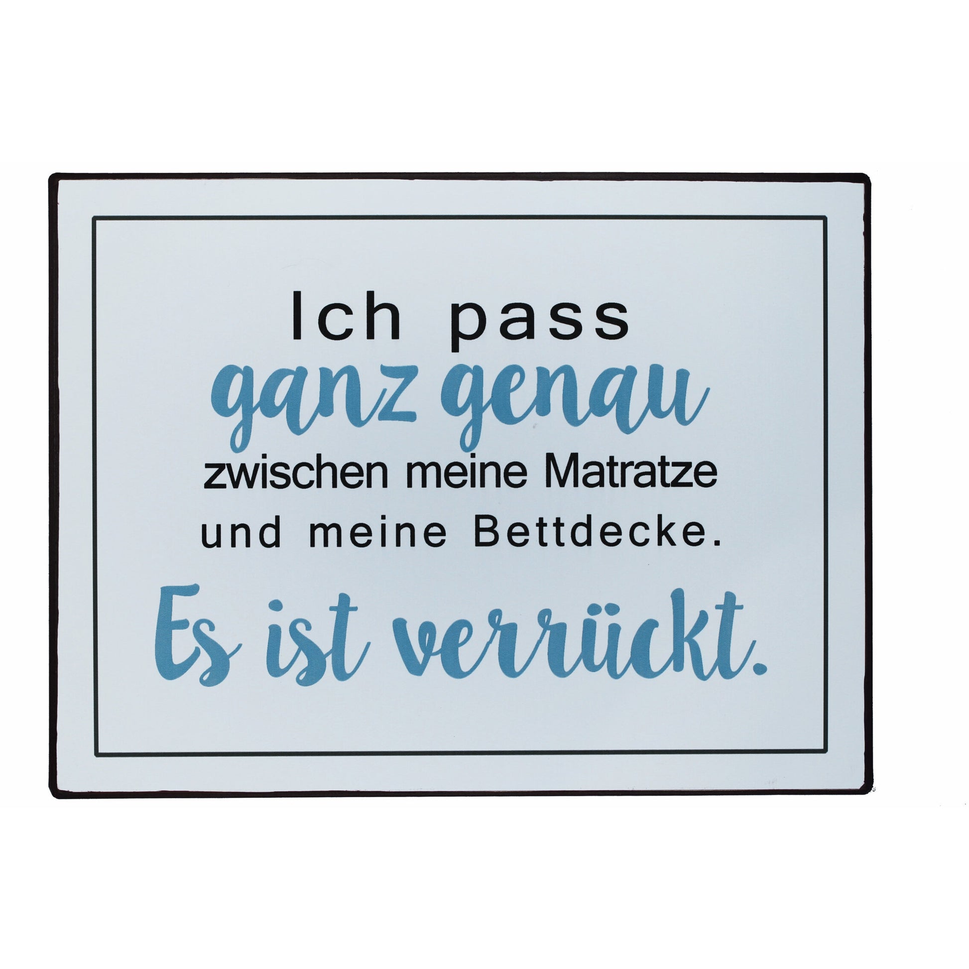 Schild aus Blech mit dem Text Ich pass ganz genau zwischen meine Matraze und meine Bettdeck. Es ist verrückt. Kann mit zwei Nägeln aufgehängt werden.