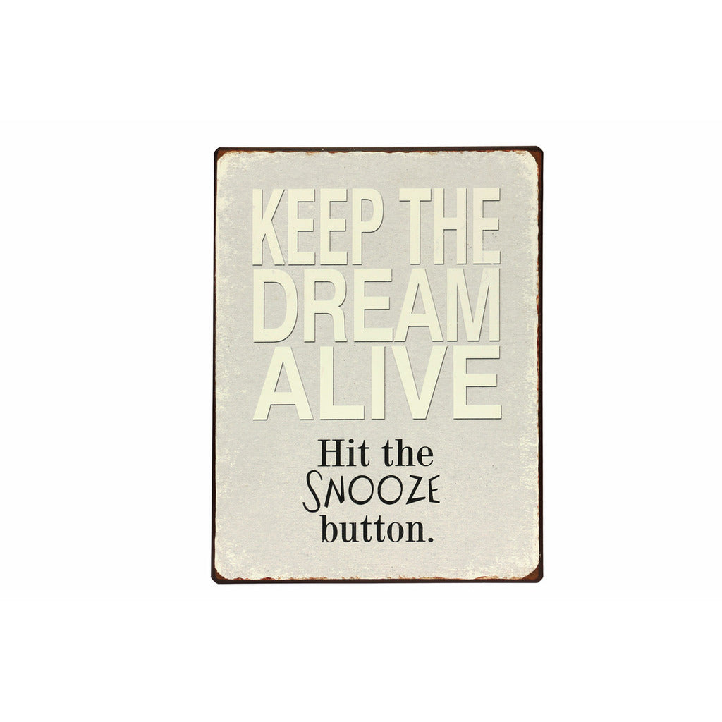 Schild mit dem Text "Keep the dream alive - hit the snooze button". Kann mit zwei Nägeln aufgehängt werden.