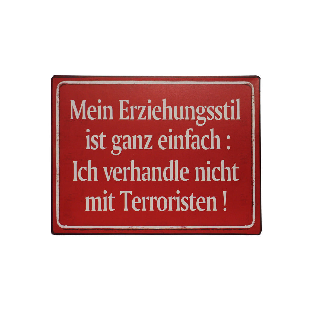 Blechschild: Mein Erziehungsstil ist ganz einfach: Ich verhandle nicht mit Terroristen