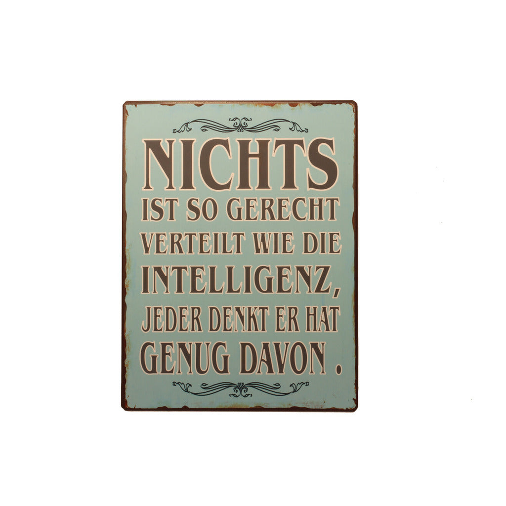 Blechschild: Nichts ist so gerecht verteilt wie die Intelligenz, jeder denkt er hat genug davon