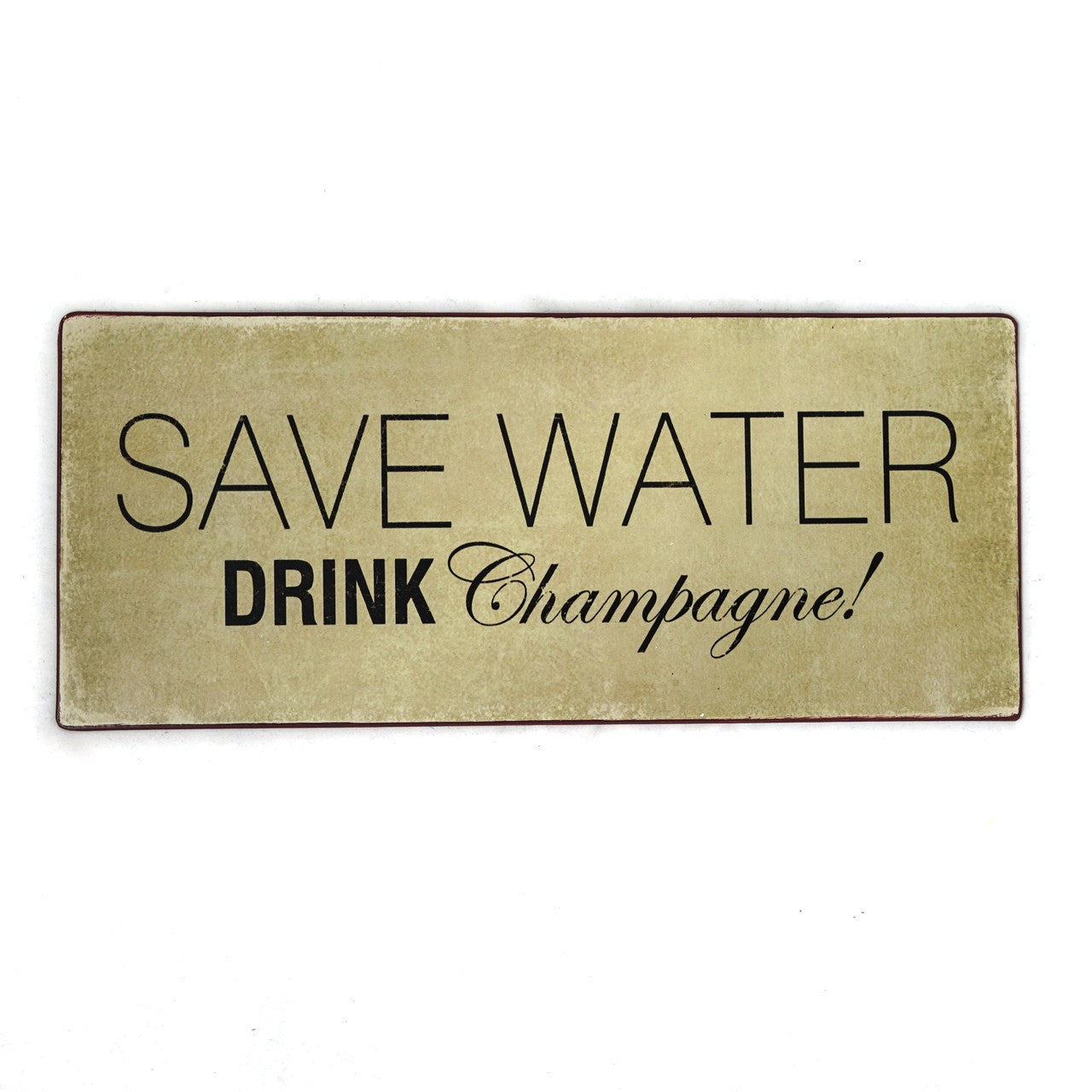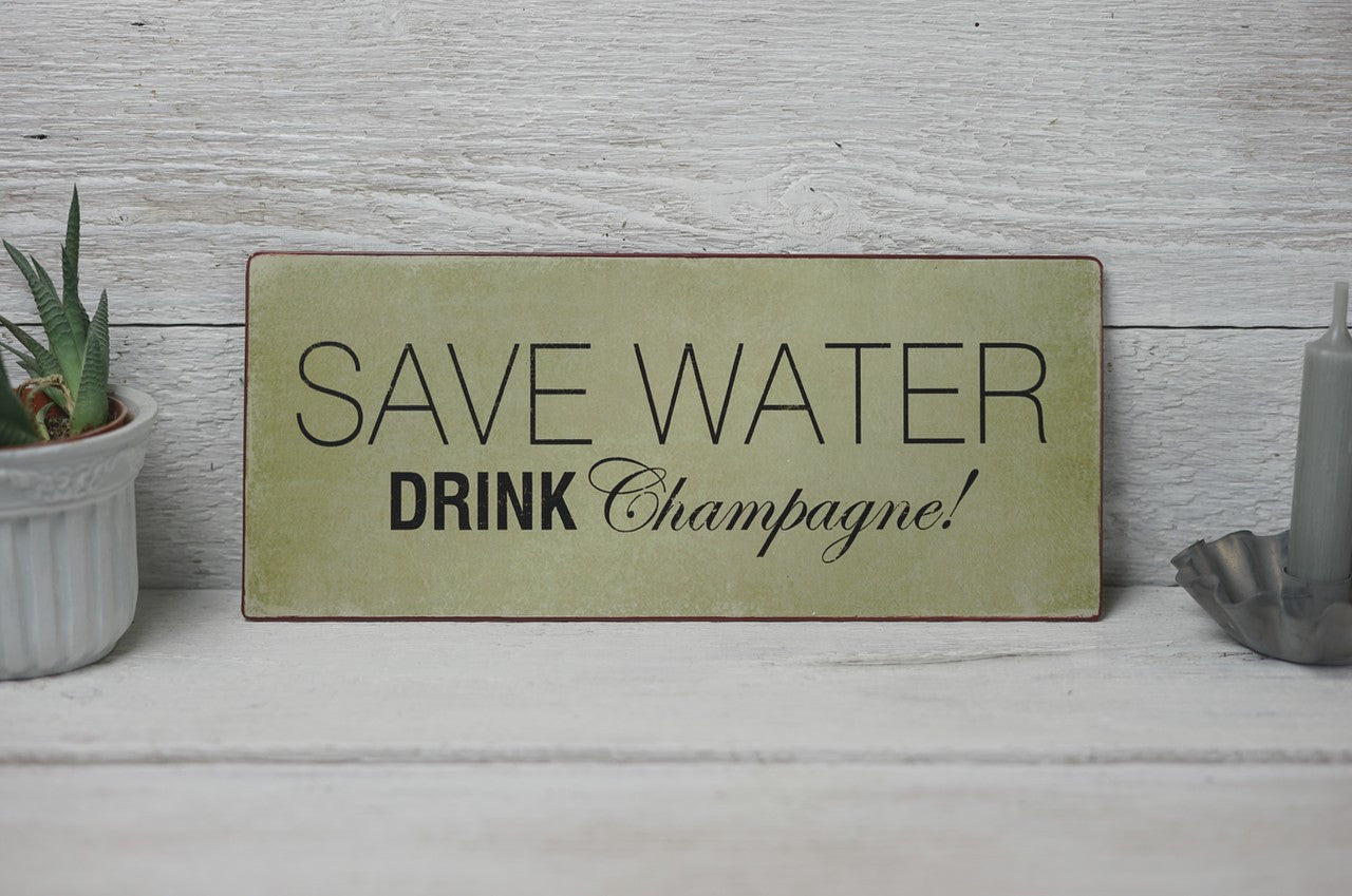Dekoratives Schild aus Blech mit dem Text. Save Water. Drink Champagne!. Kann mit zwei Nägeln aufgehängt werden.