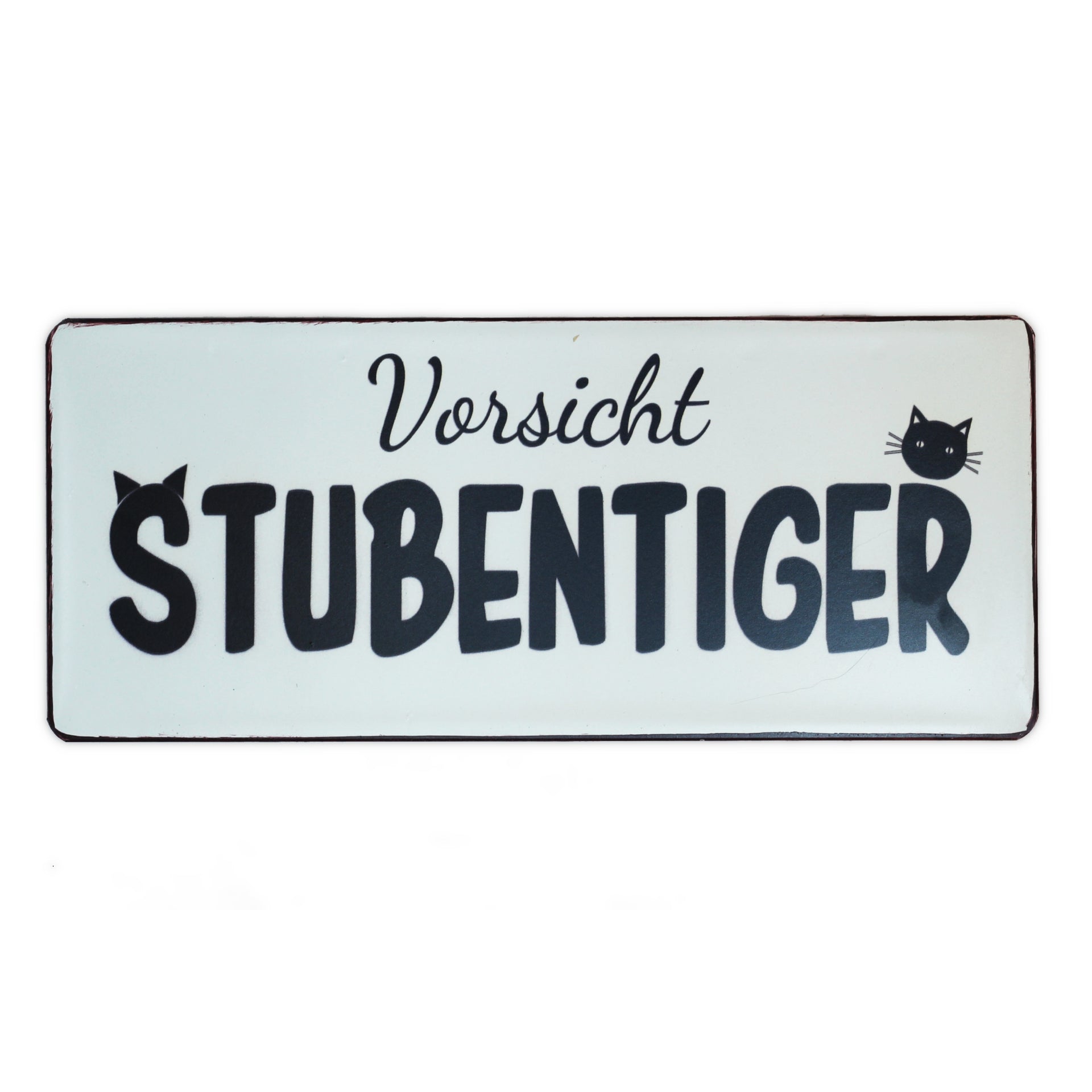 Schild aus Blech mit dem Text Vorsicht Stubentiger. Kann mit zwei Nägeln aufgehängt werden.