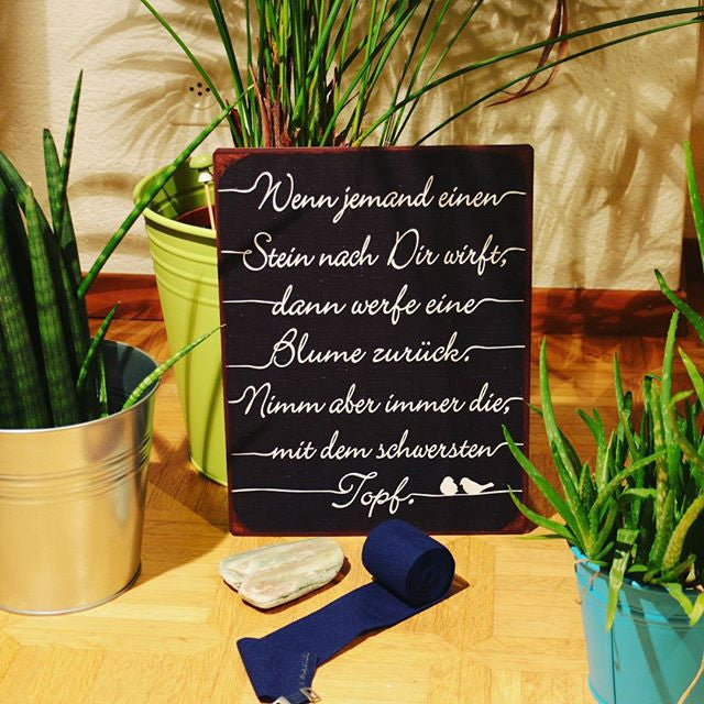 Blechschild: Wenn jemand einen Stein nach Dir wirft, dann werfe eine Blume zurück. Nimm aber immer die, mit dem schwersten Topf.