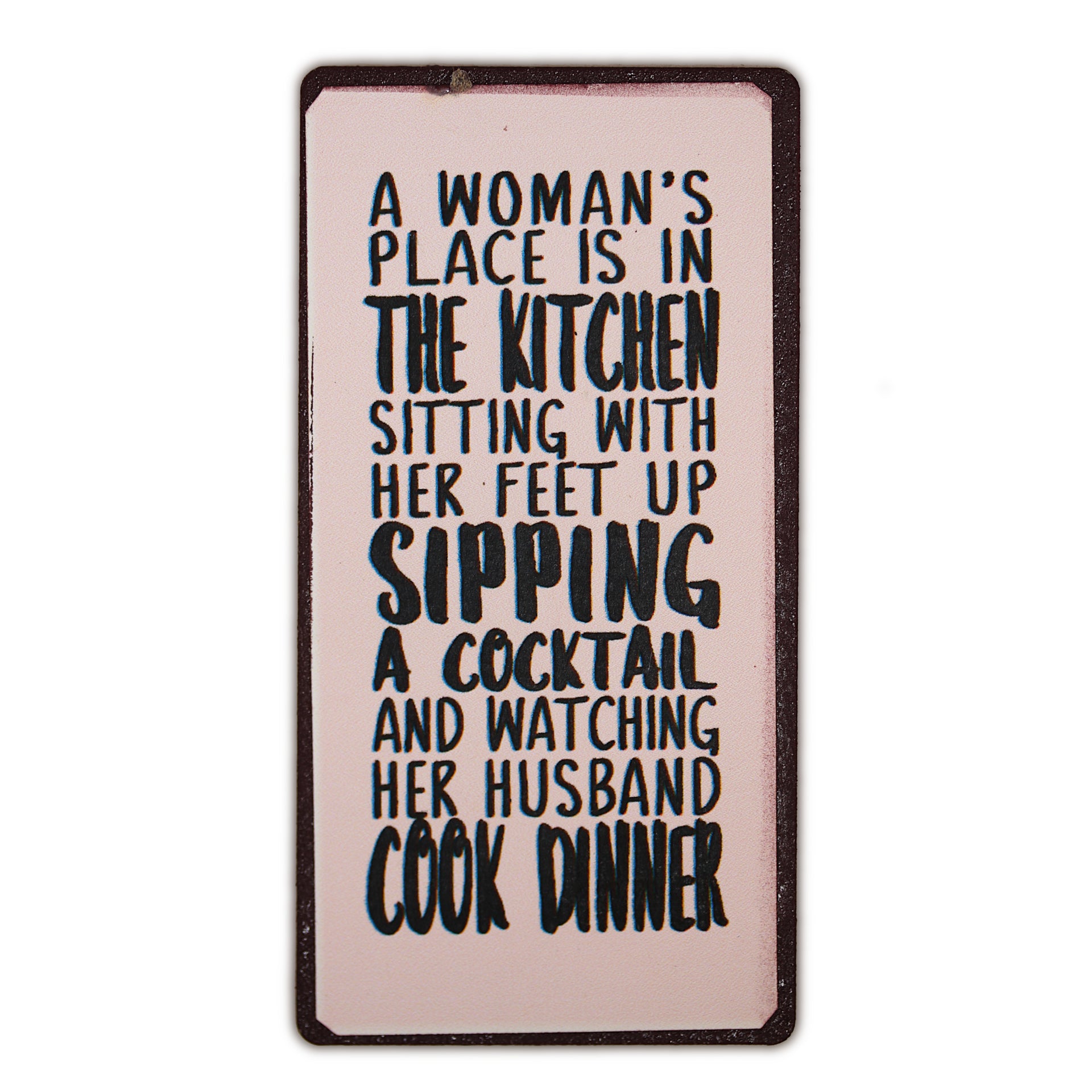 Kühlschrank-Magnet mit der Aufschrift: A woman's place is in the kitchen sitting with her feet up sipping a cocktail and watching her husband cook dinner