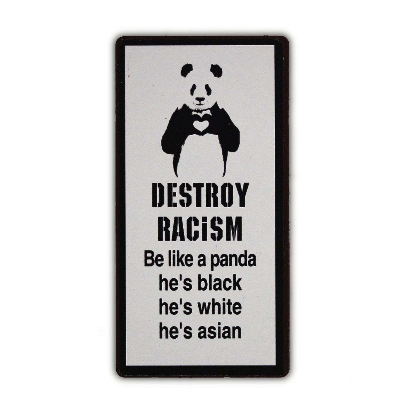 Magnet mit dem Text "Destroy racism. Be like a panda. He's black. He's white. He's asian"