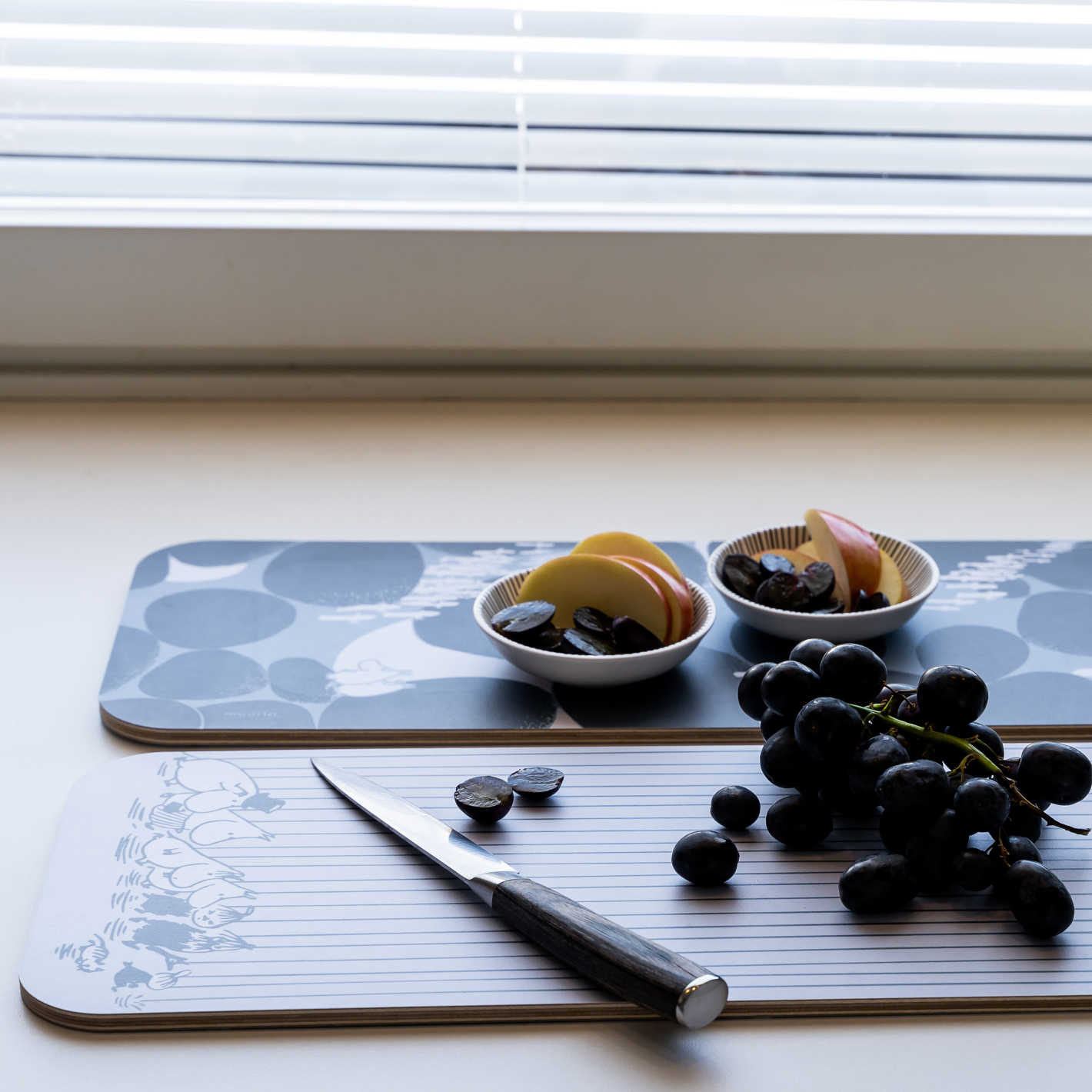 Die Chop&Serve Boards kombinieren zwei Funktionen in einem Produkt: Schneiden und Servieren. Das Schneidebrett hat zwei beschichtete Seiten in verschiedenen Designs und wird somit auch gleich zum Servierbrett.