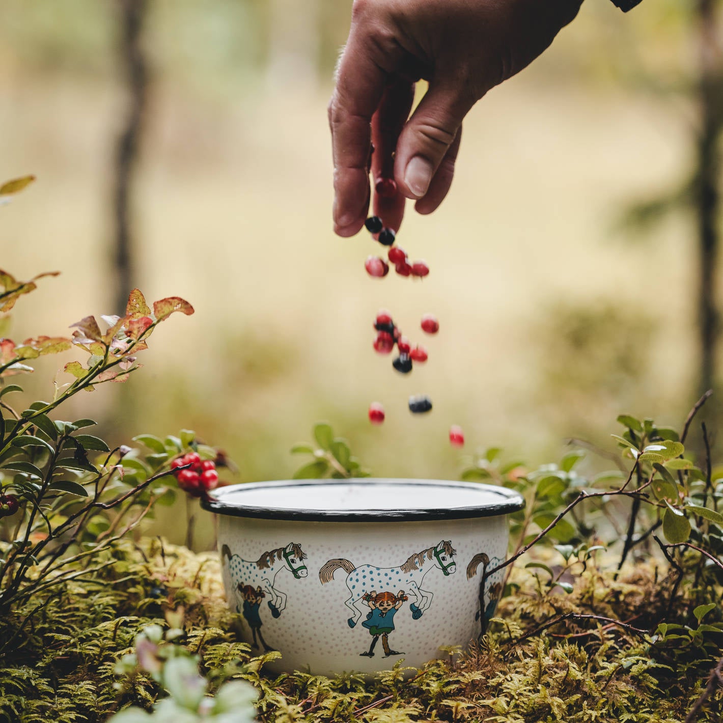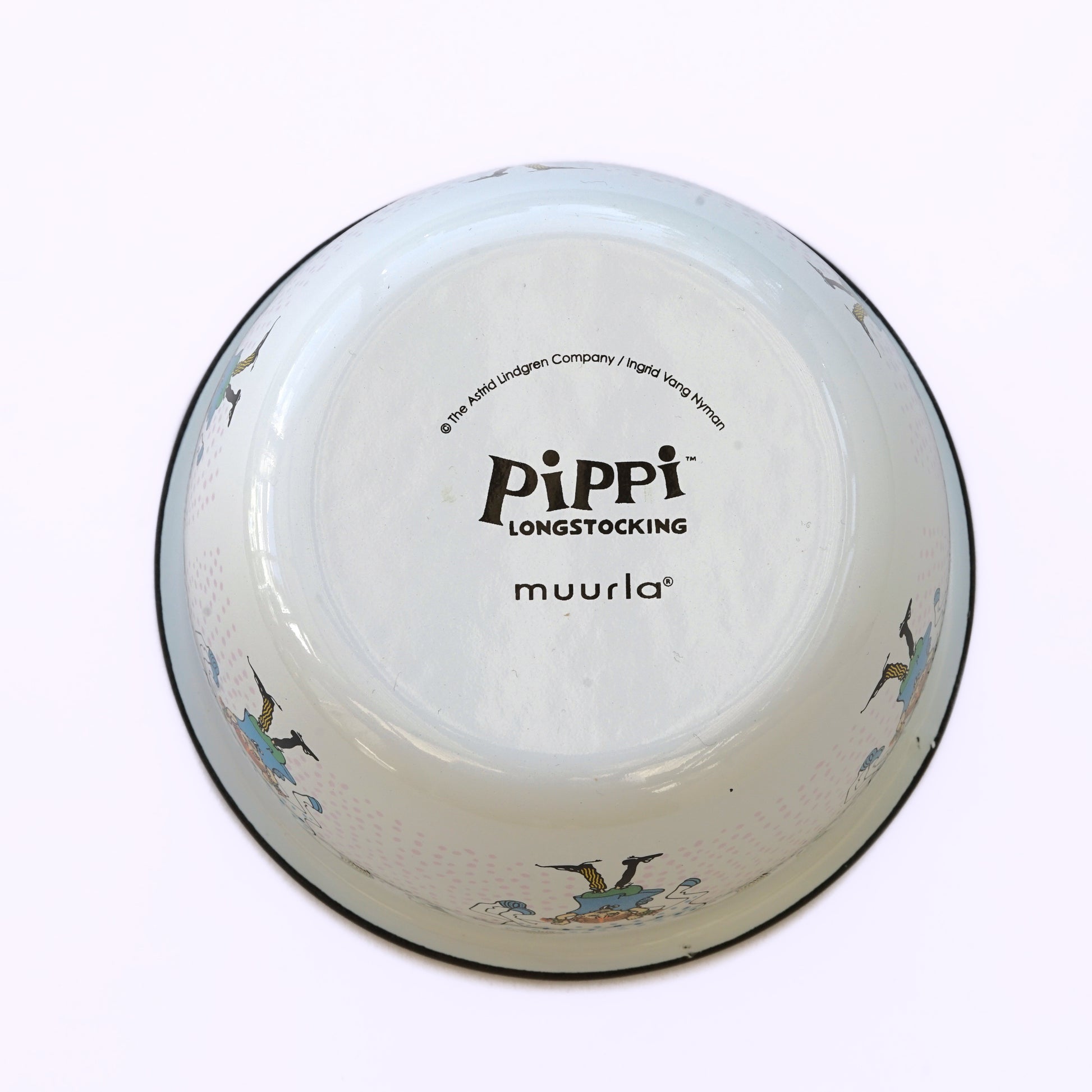 Wer kennt sie nicht, Pippi Langstrumpf, das unangepasste, wilde Mädchen mit den roten Zöpfen und ihre Abenteuer. Immer mit dabei sind der Affe Herr Nilsson und das Pferd kleiner Onkel. Die illustrierte Märchenfigur von der schwedischen Kinderbuchautorin Astrid Lindgren wurde hier wunderschön auf der Emailleschüssel vom finnischen Hersteller muurla verewigt.