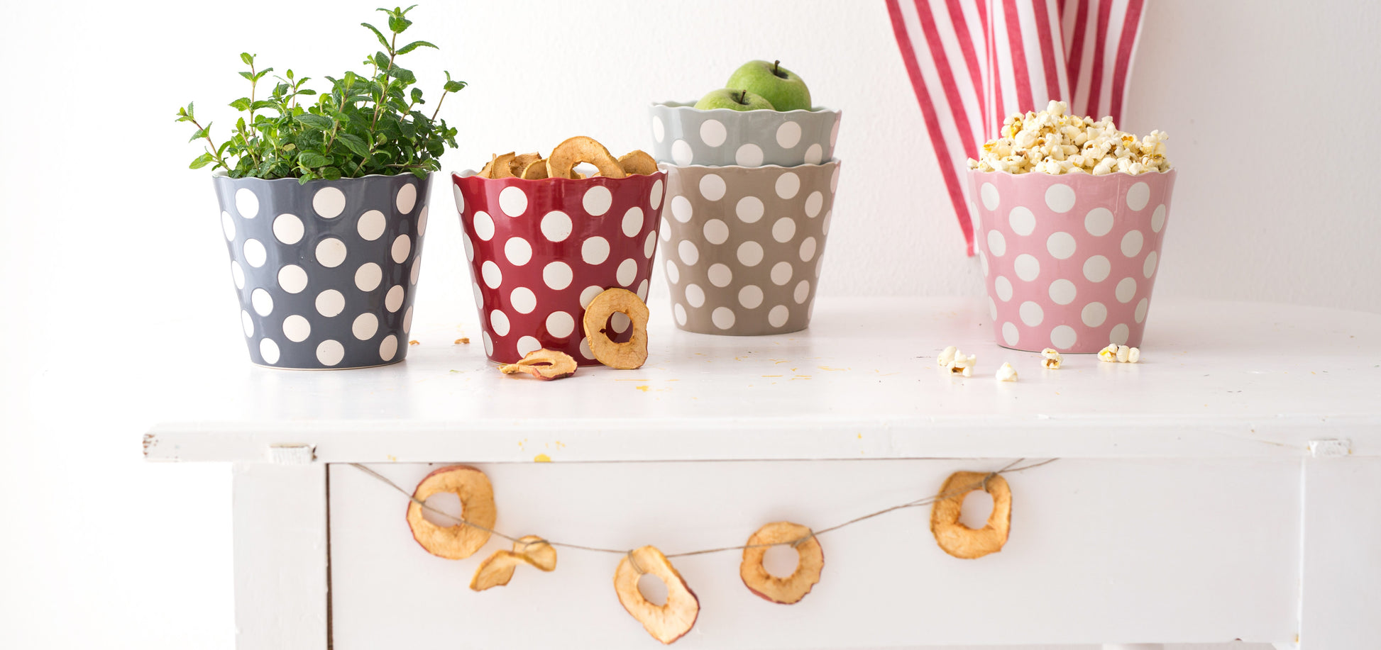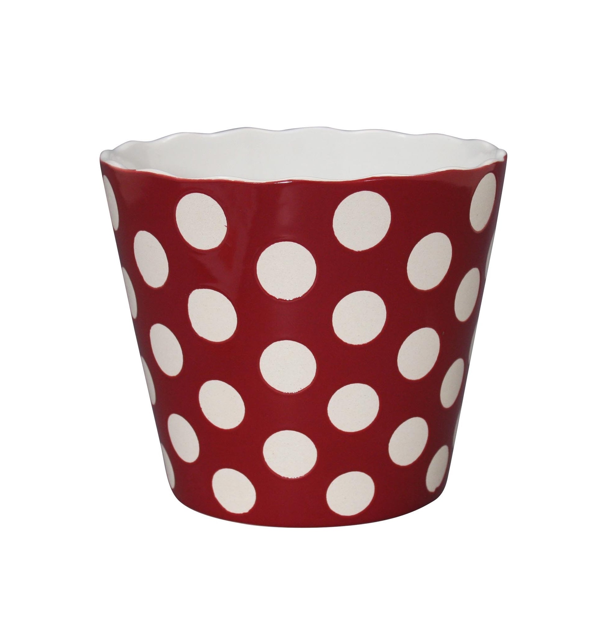 Keramikschüssel in rot mit grossen, weissen Punkten der Serie "HappyStars" vom dänischen Label Krasilnikoff.