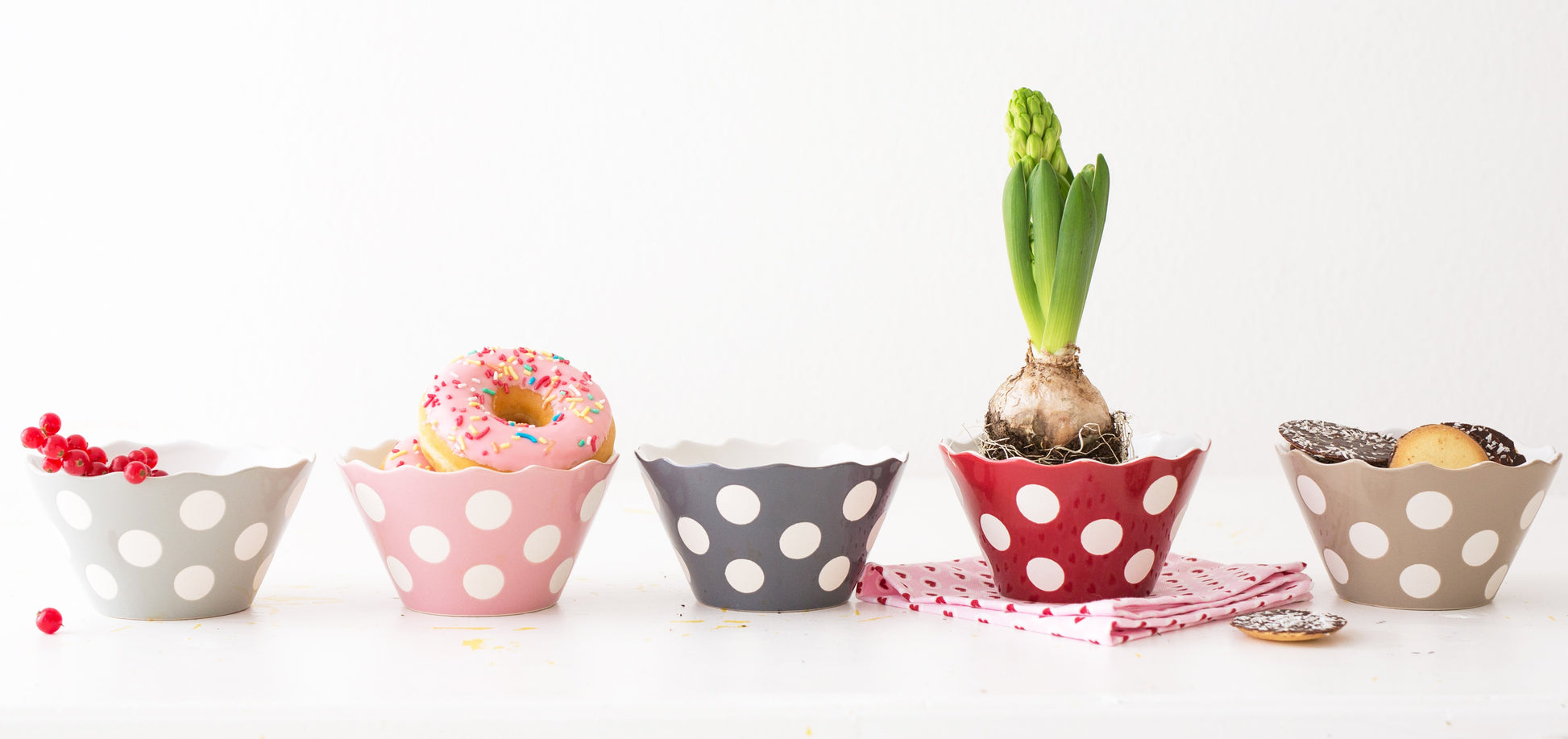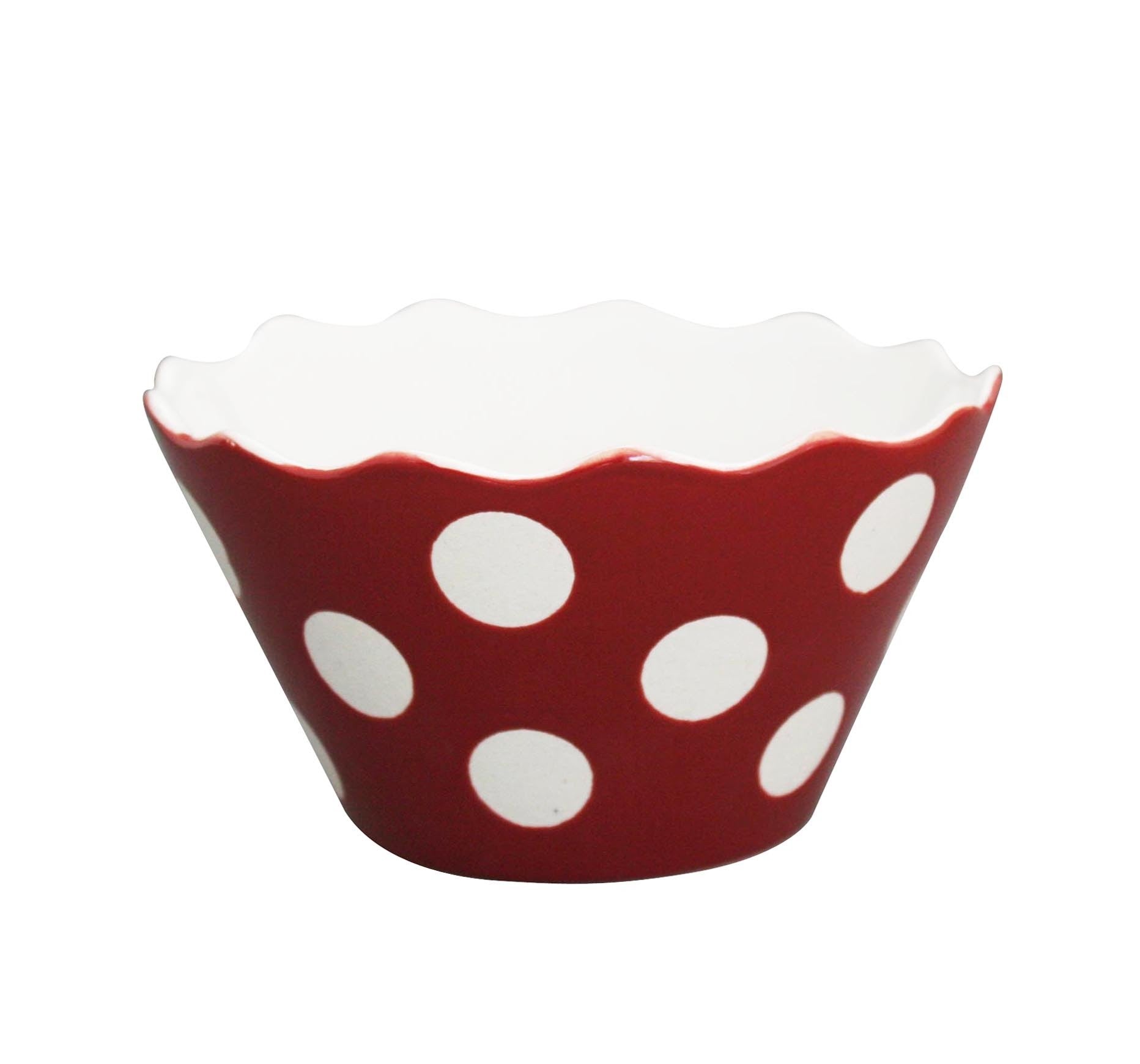 Keramikschüssel in rot mit grossen, weissen Punkten der Serie "HappyStars" vom dänischen Label Krasilnikoff.