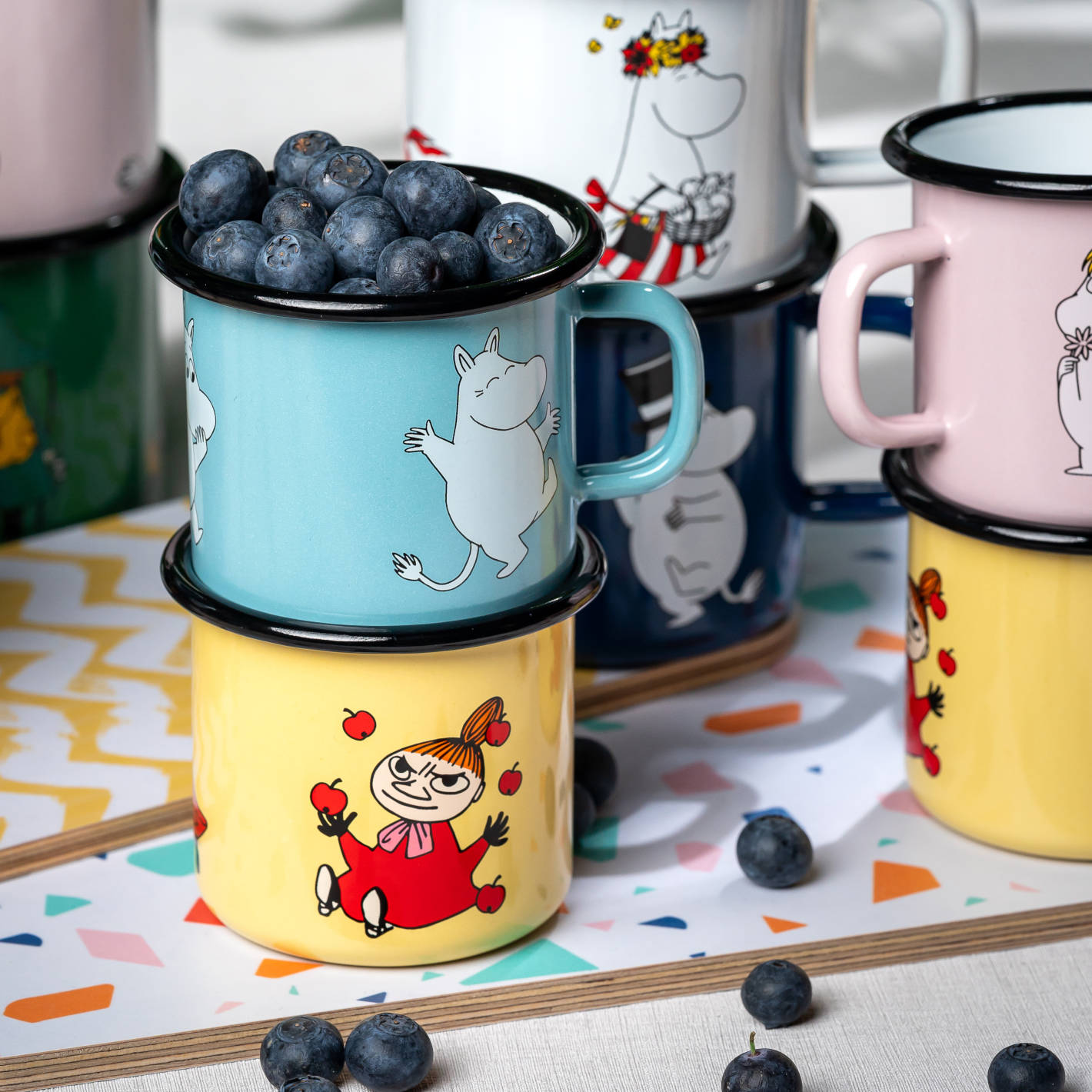 Wer kennt sie nicht: Die Mumin, die nilpferdartigen Trollwesen und ihre Fruende die im idyllischen Mumintal irgendwo in Finnland leben. Die illustrierte Märchenfigur von der finnischen Kinderbuchautorin Tove Jansson wurde hier wunderschön auf der Emailletasse vom finnischen Hersteller Muurla verewigt.