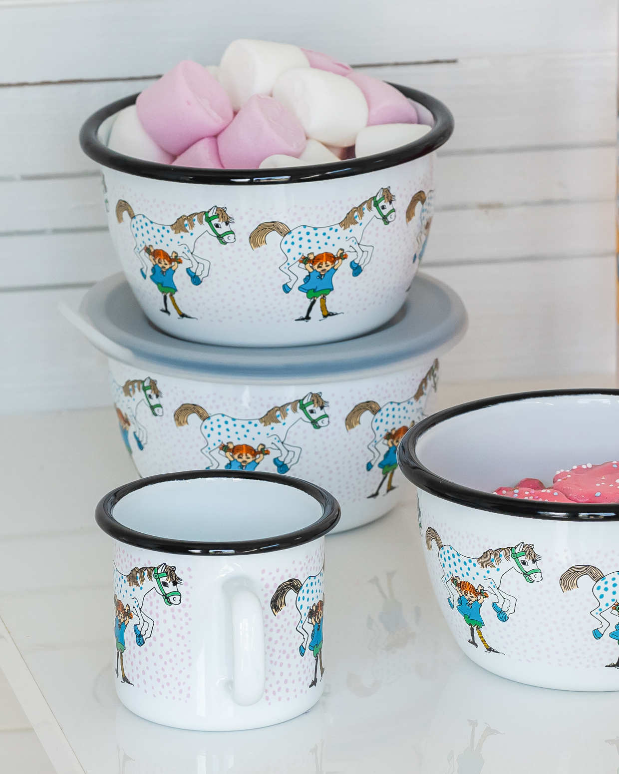 Wer kennt sie nicht, Pippi Langstrumpf, das unangepasste, wilde Mädchen mit den roten Zöpfen und ihre Abenteuer. Immer mit dabei sind der Affe Herr Nilsson und das Pferd kleiner Onkel. Die illustrierte Märchenfigur von der schwedischen Kinderbuchautorin Astrid Lindgren wurde hier wunderschön auf der Emailletasse vom finnischen Hersteller muurla verewigt.
