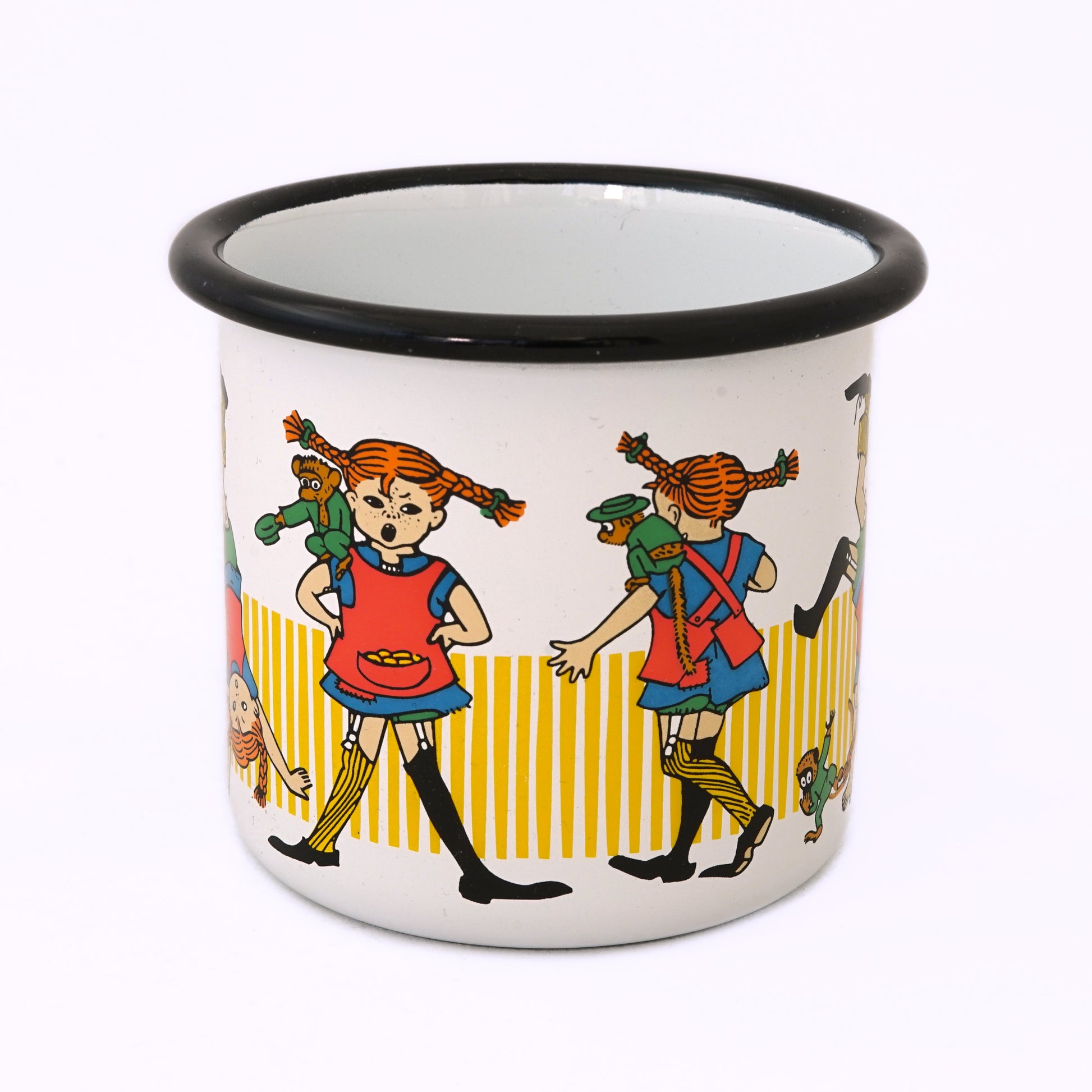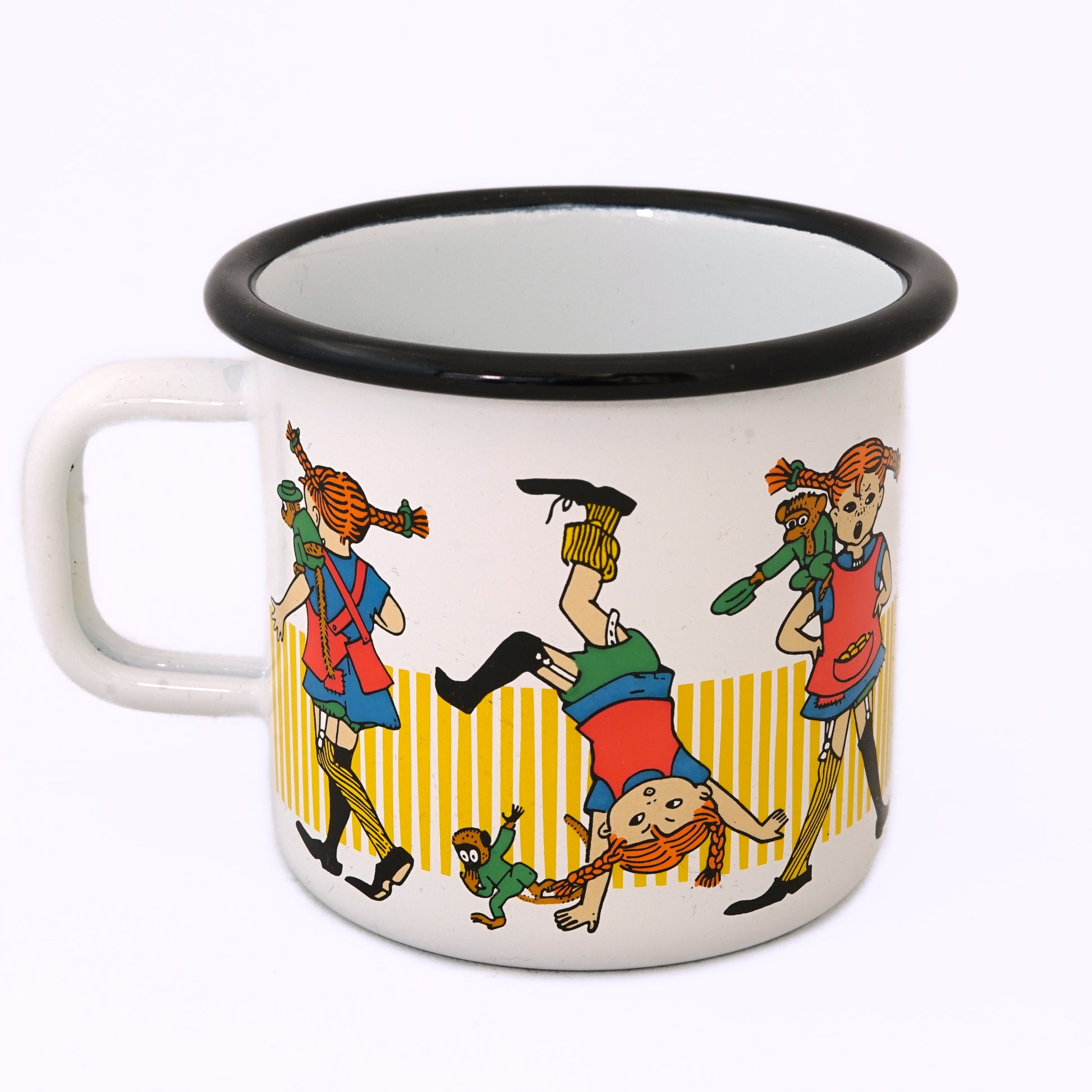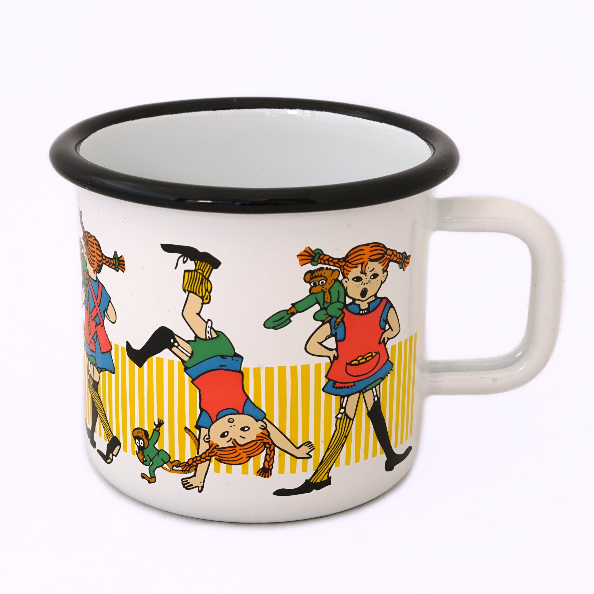 Wer kennt sie nicht, Pippi Langstrumpf, das unangepasste, wilde Mädchen mit den roten Zöpfen und ihre Abenteuer. Immer mit dabei sind der Affe Herr Nilsson und das Pferd kleiner Onkel. Die illustrierte Märchenfigur von der schwedischen Kinderbuchautorin Astrid Lindgren wurde hier wunderschön auf der Emailletasse vom finnischen Hersteller muurla verewigt.