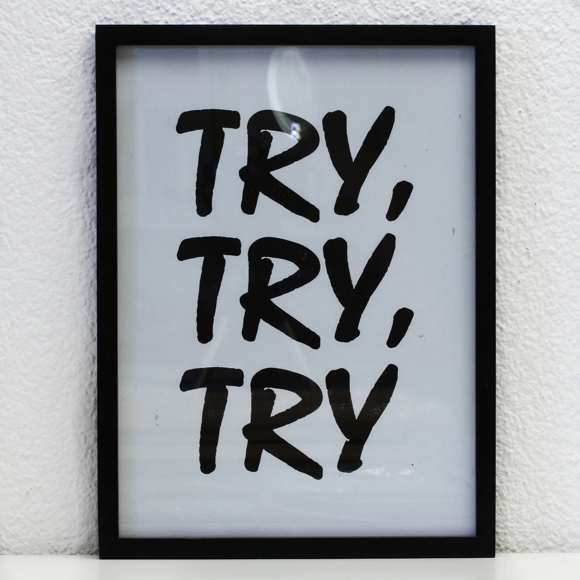 Bild mit dem Spruch "Try Try Try" mit schwarzem Rahmen aus Holz.